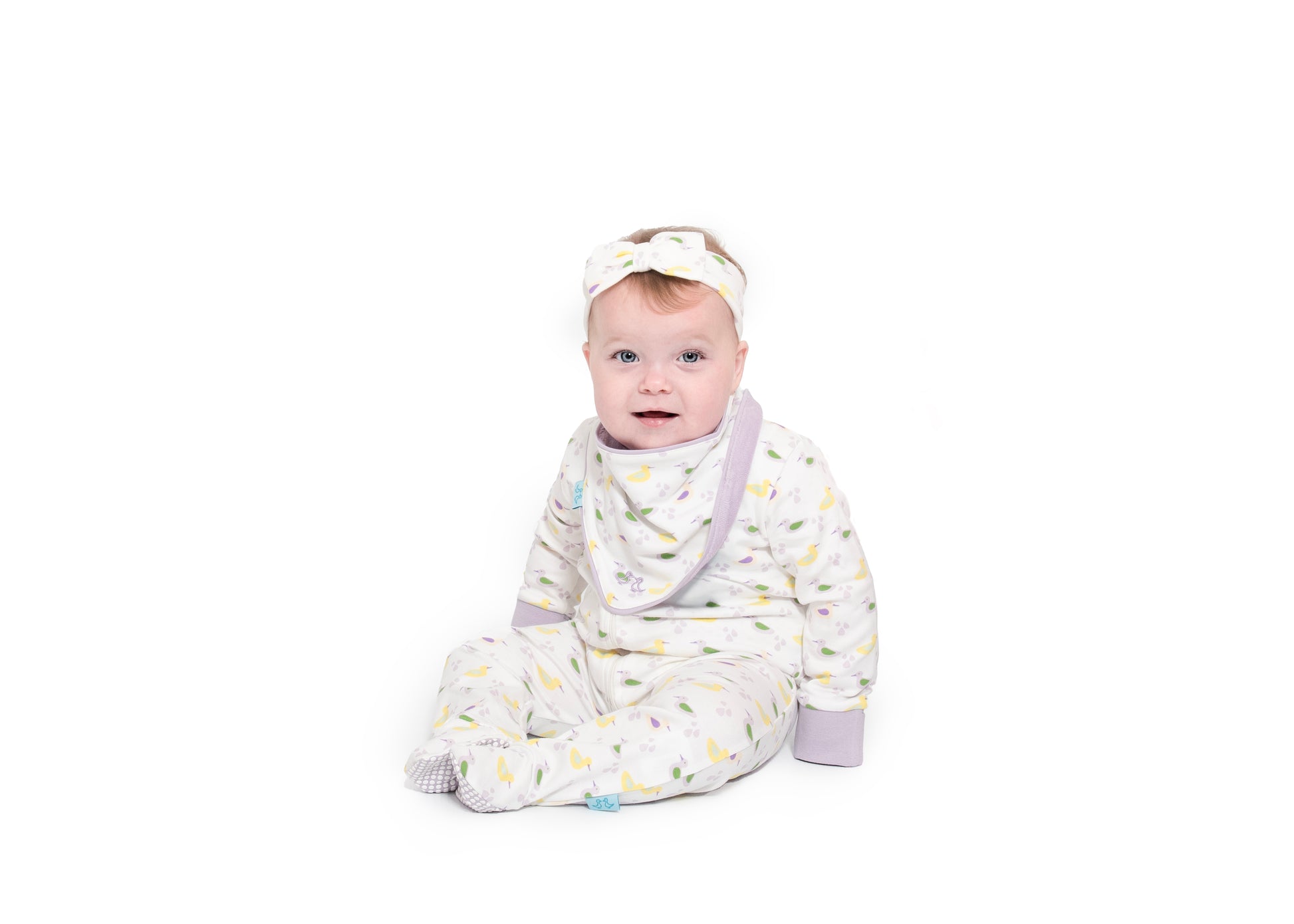 Tenderly crafted from a beautiful organic cotton, it features a concealed zip front easy opening, contrast colour cuffs and beautiful matching headband.