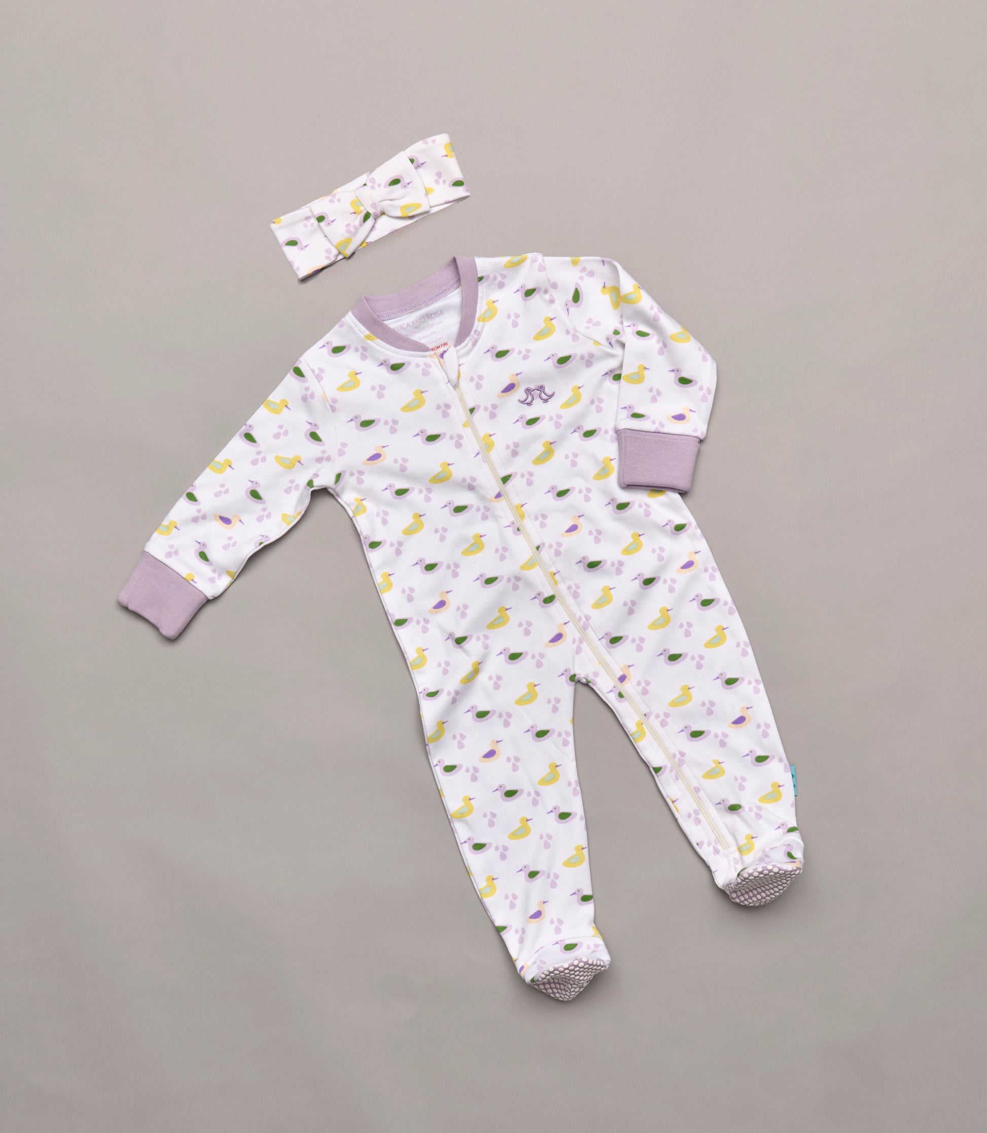 Our new Lilac duck print girl's sleepsuit will make an adorable addition to your baby’s wardrobe.