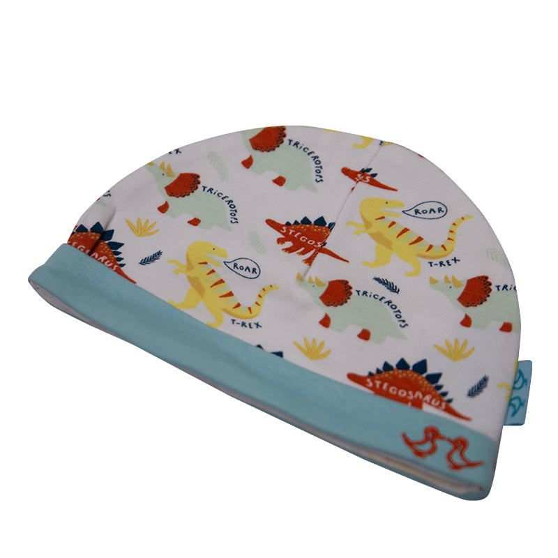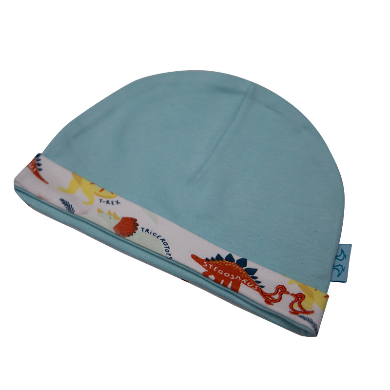 This baby hat is an adorable way to keep your baby’s head protected and warm. One hat is in our dinosaur print and one matching plain soft blue option.