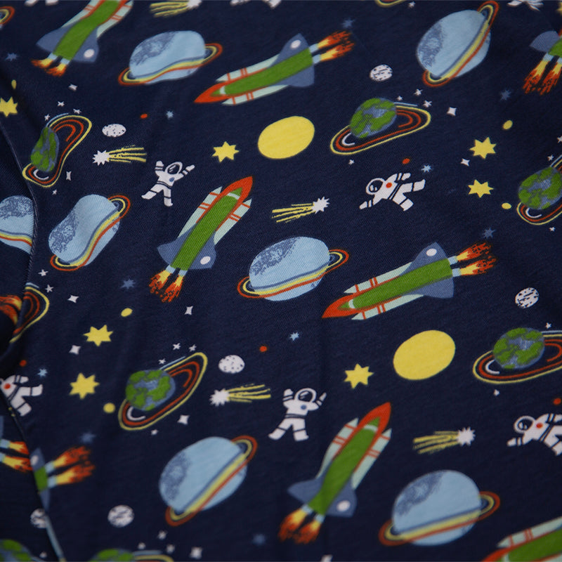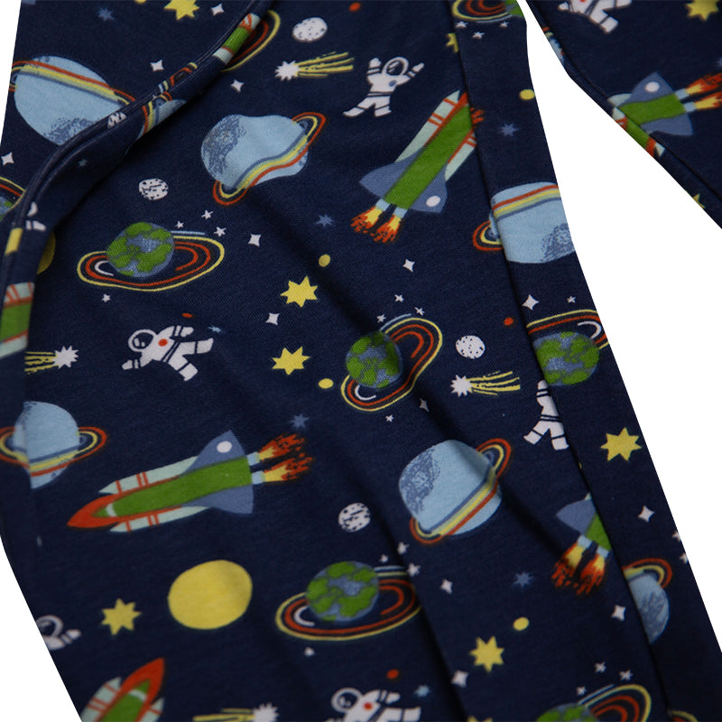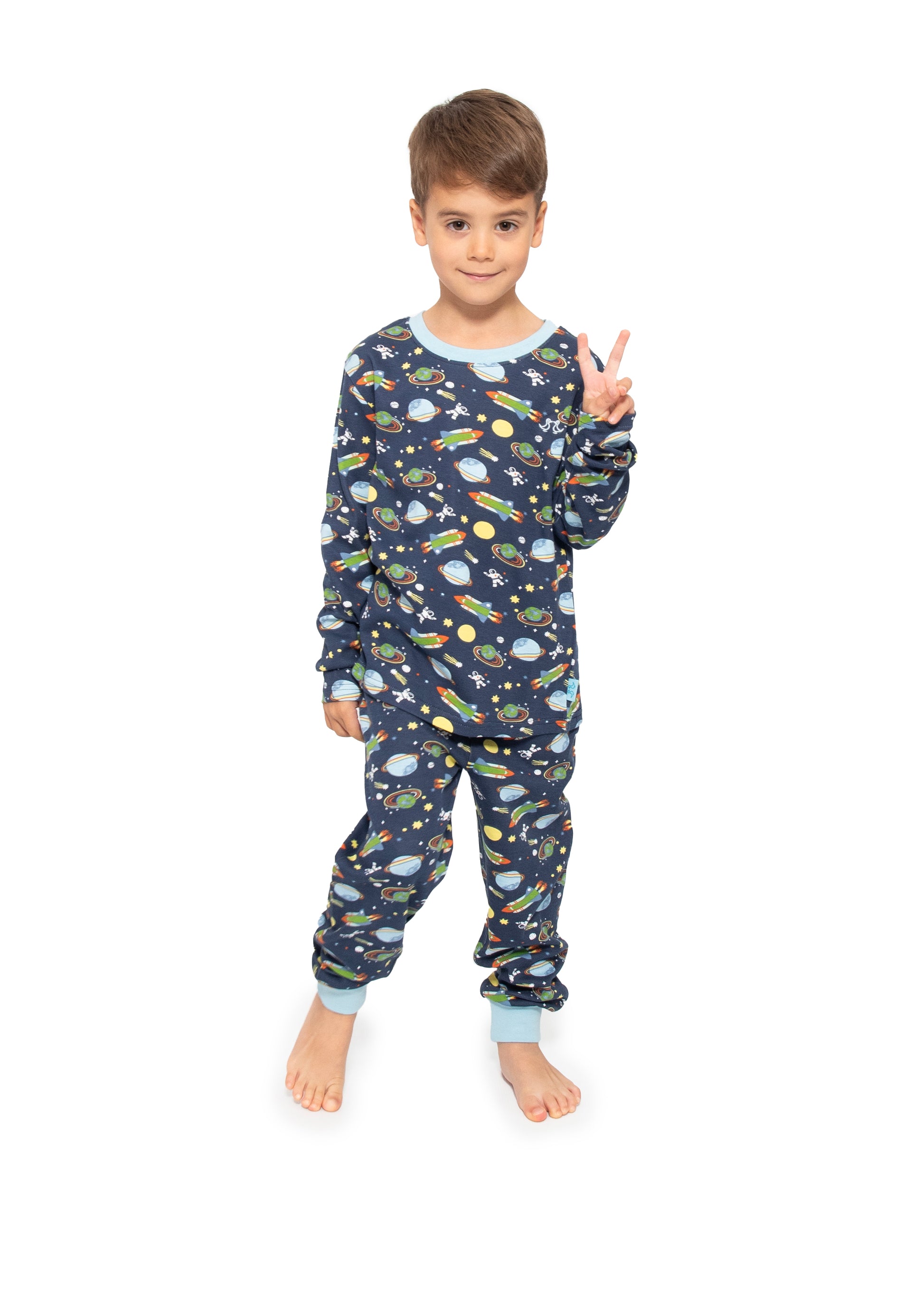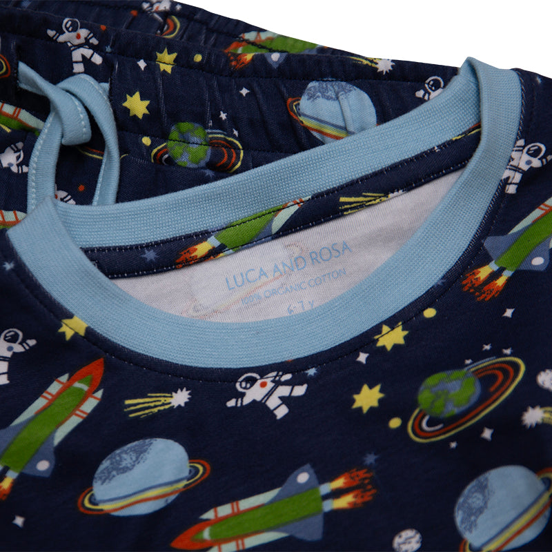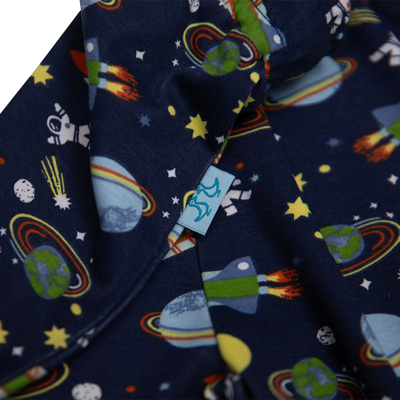 Perfect for snoozing and relaxing around the house, these space thened kid’s pyjamas are soft and durable. Designed in super soft, high quality organic cotton, they guarantee ultimate comfort right through until morning.These adorable boy's pyjamas come embroidered with our distinctive logo.