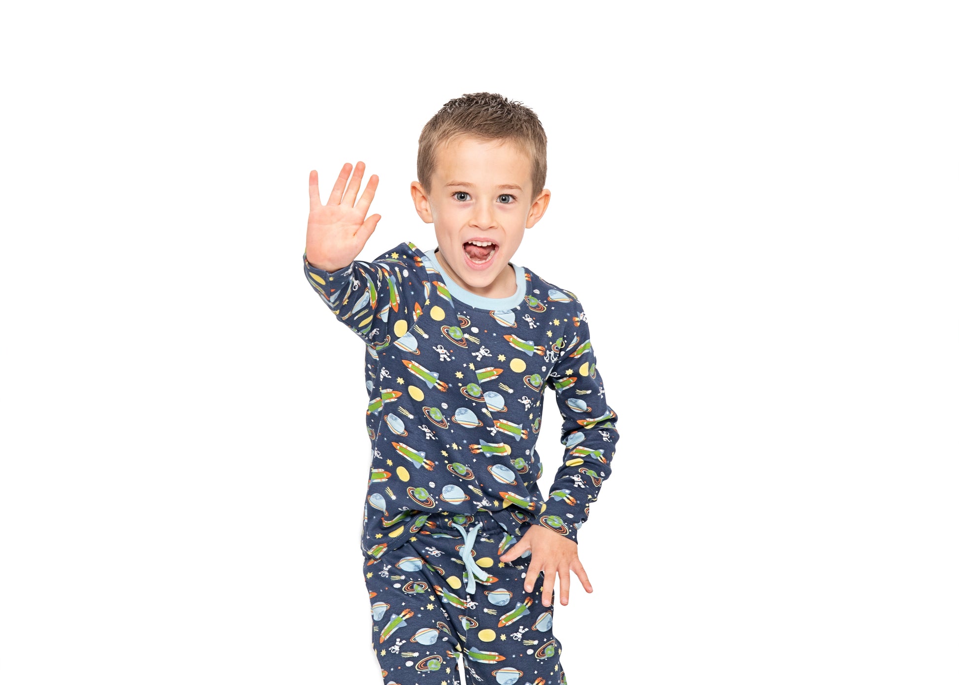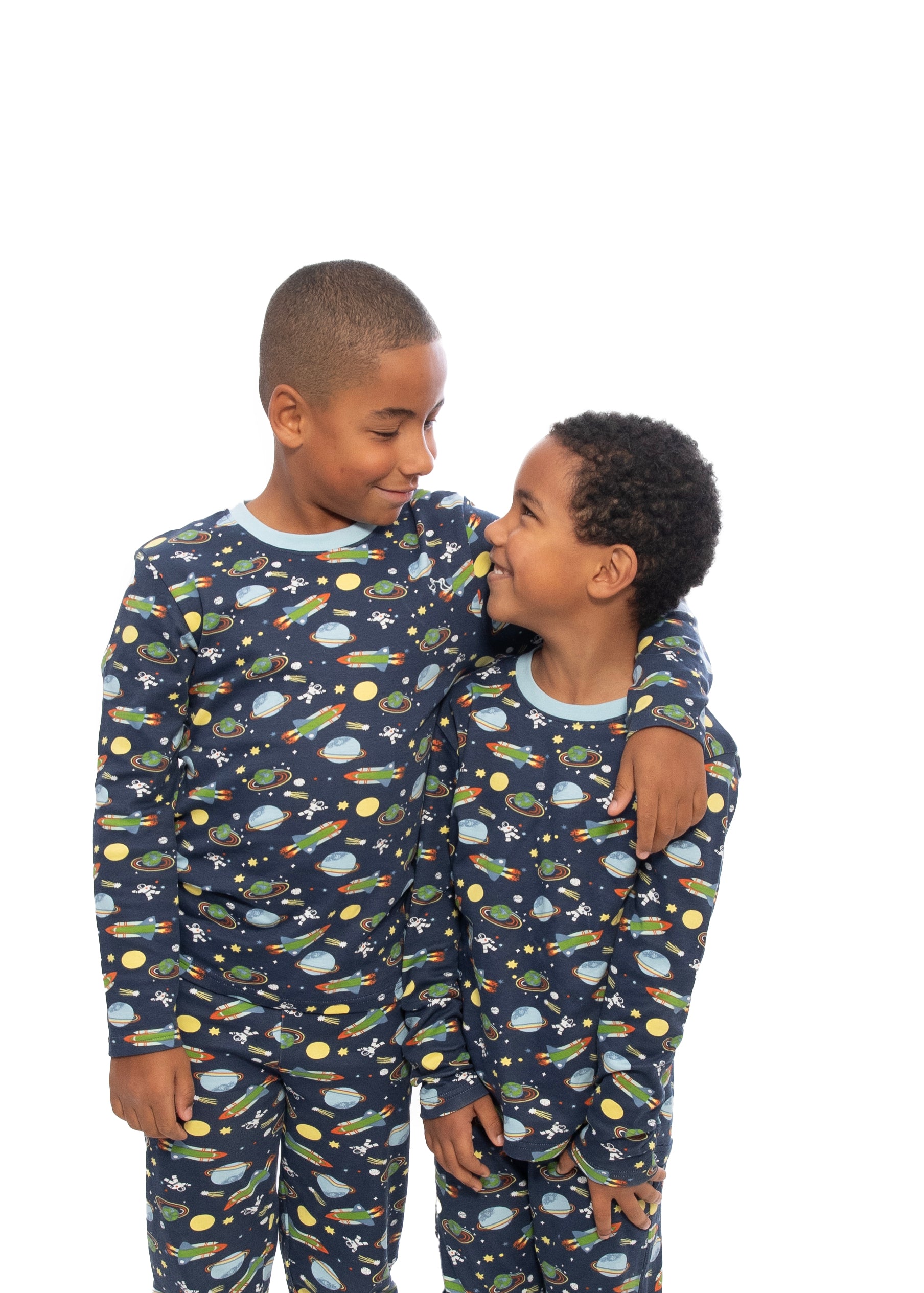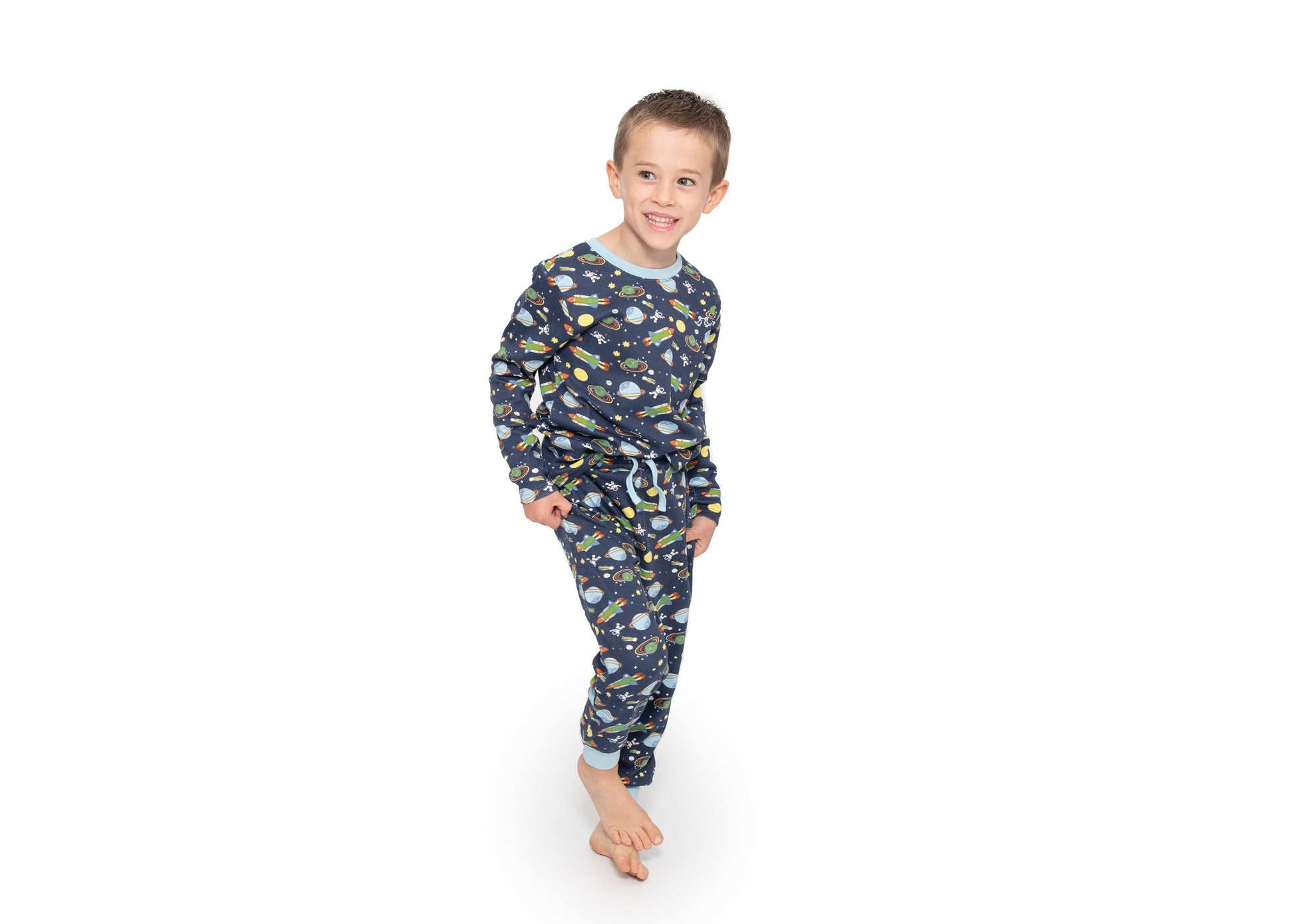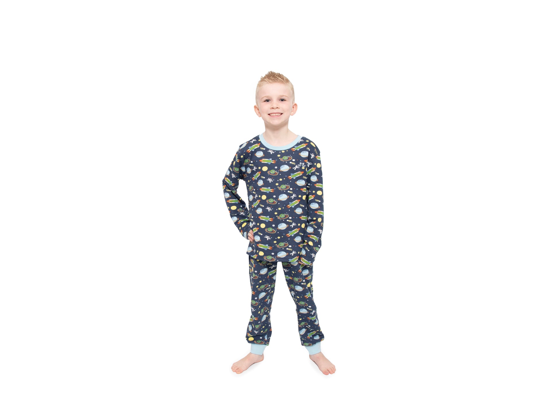 Perfect for snoozing and relaxing around the house, these space thened kid’s pyjamas are soft and durable. Designed in super soft, high quality organic cotton, they guarantee ultimate comfort right through until morning.These adorable boy's pyjamas come embroidered with our distinctive logo.
