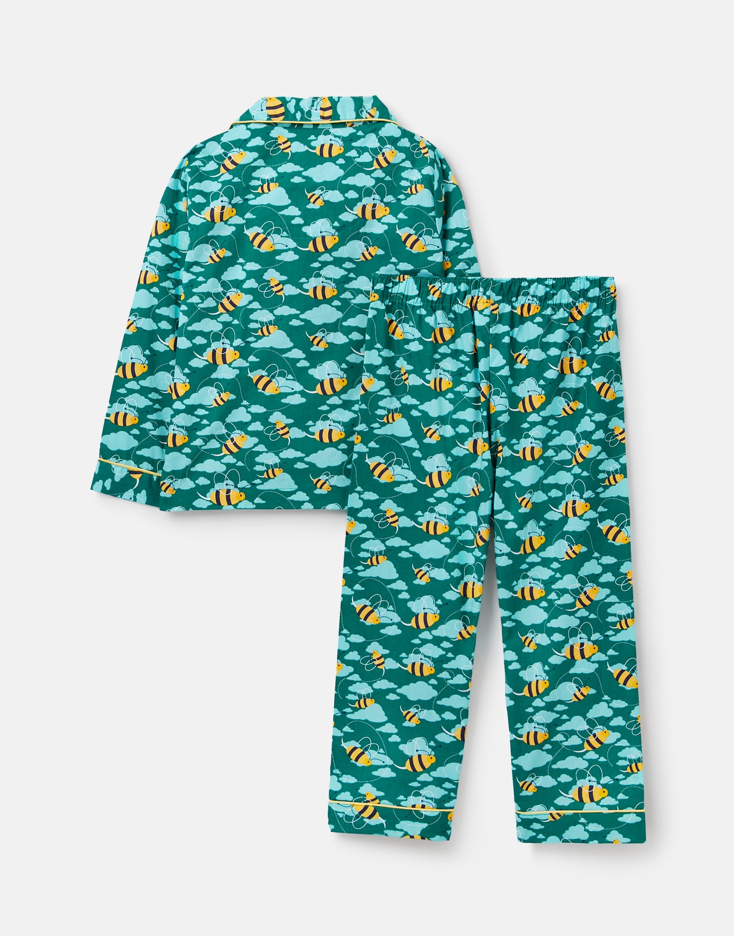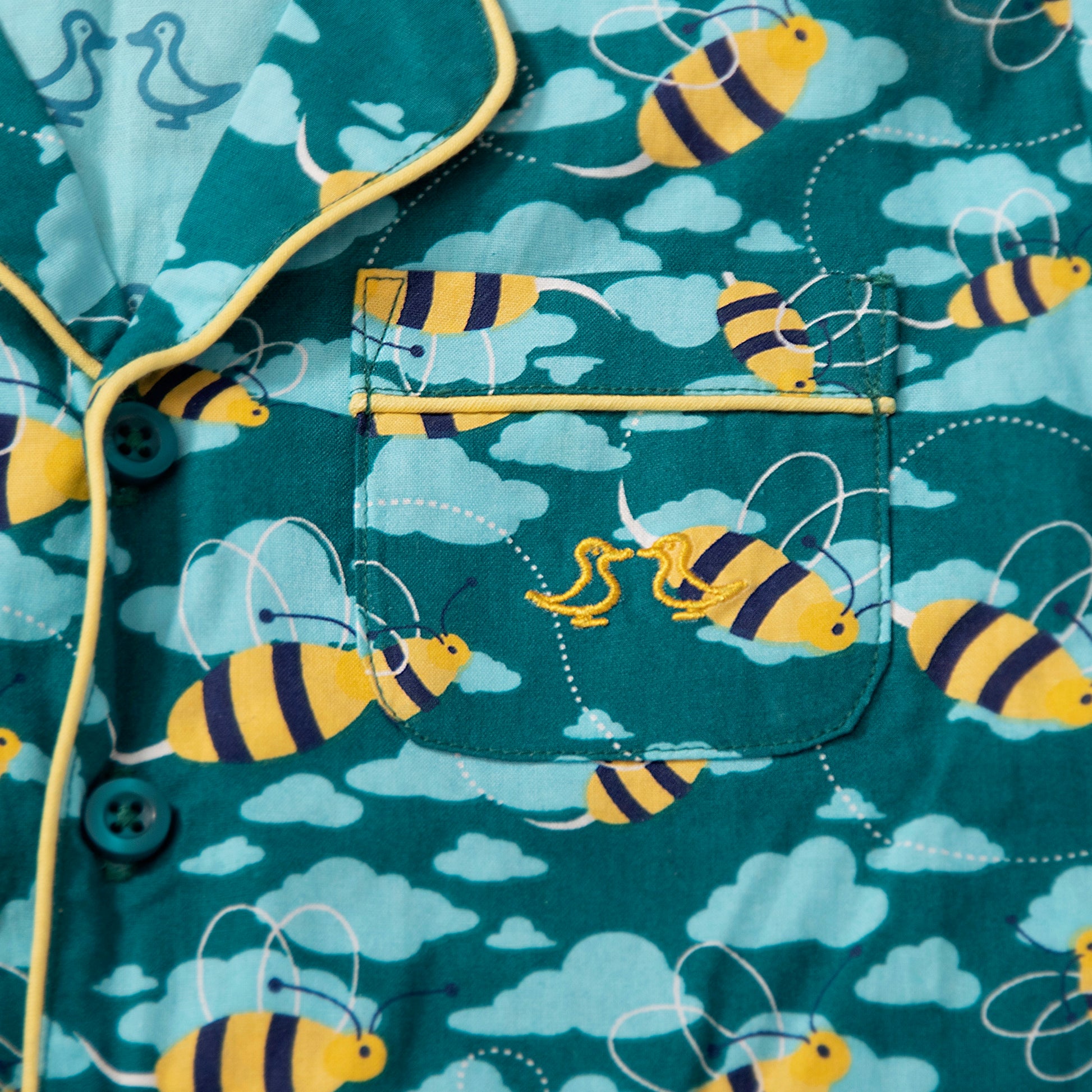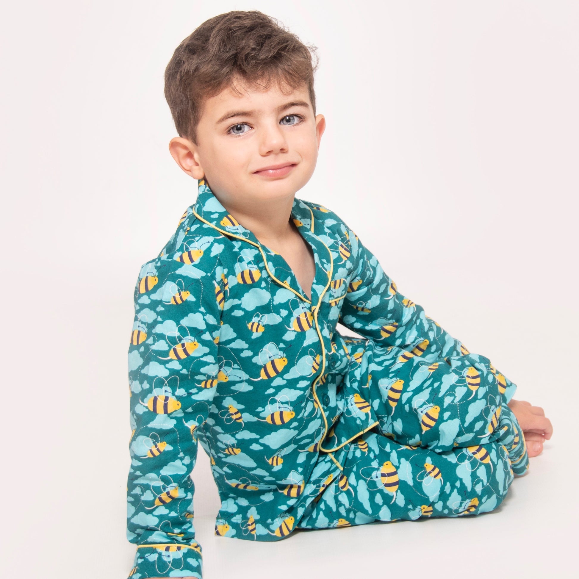 Inspire sweet dreams and a blissful night’s sleep in these sumptuous two-piece boy's pyjamas. Designed in our dark aqua mixed bee print, they have been affectionately crafted from 100% organic cotton poplin.