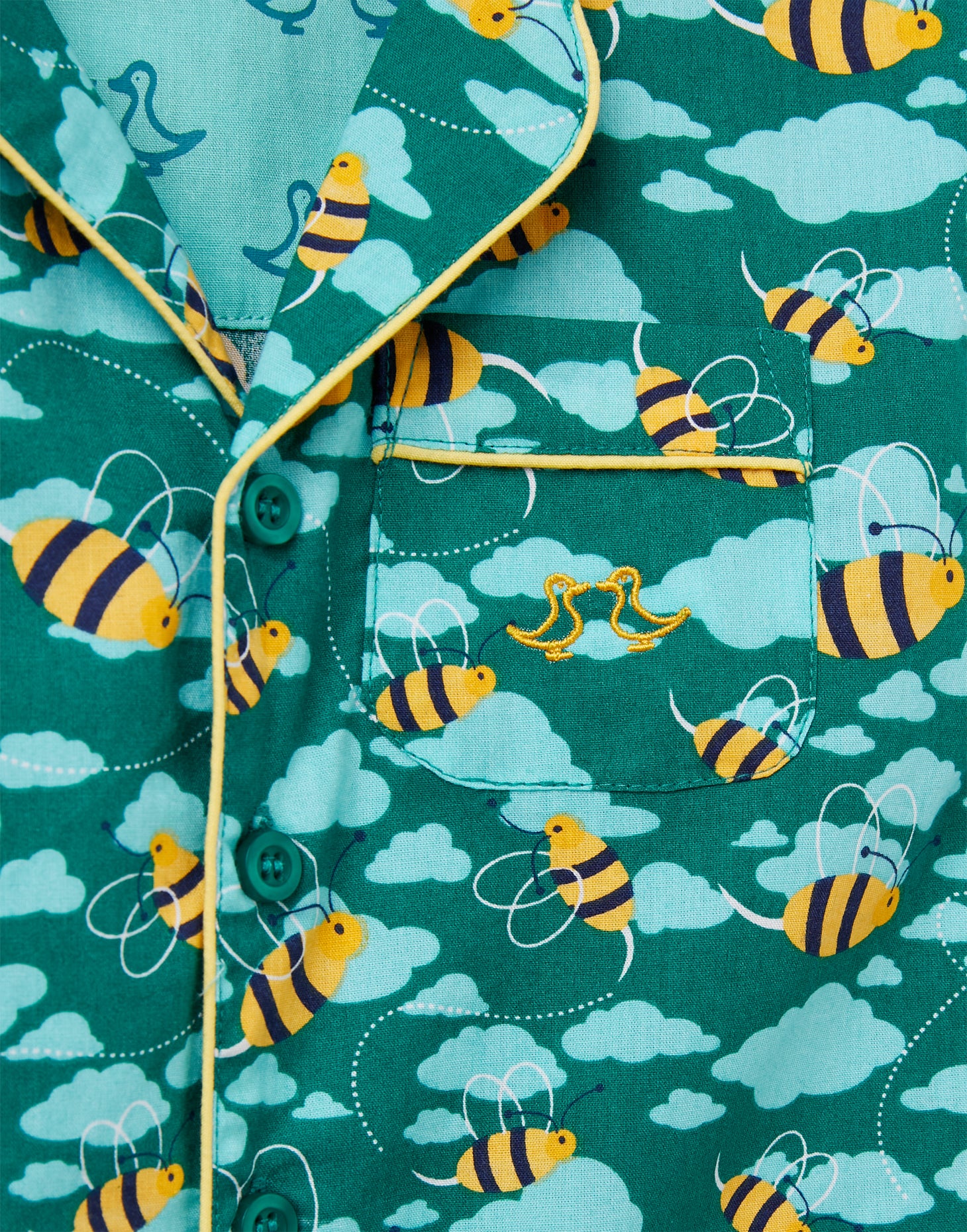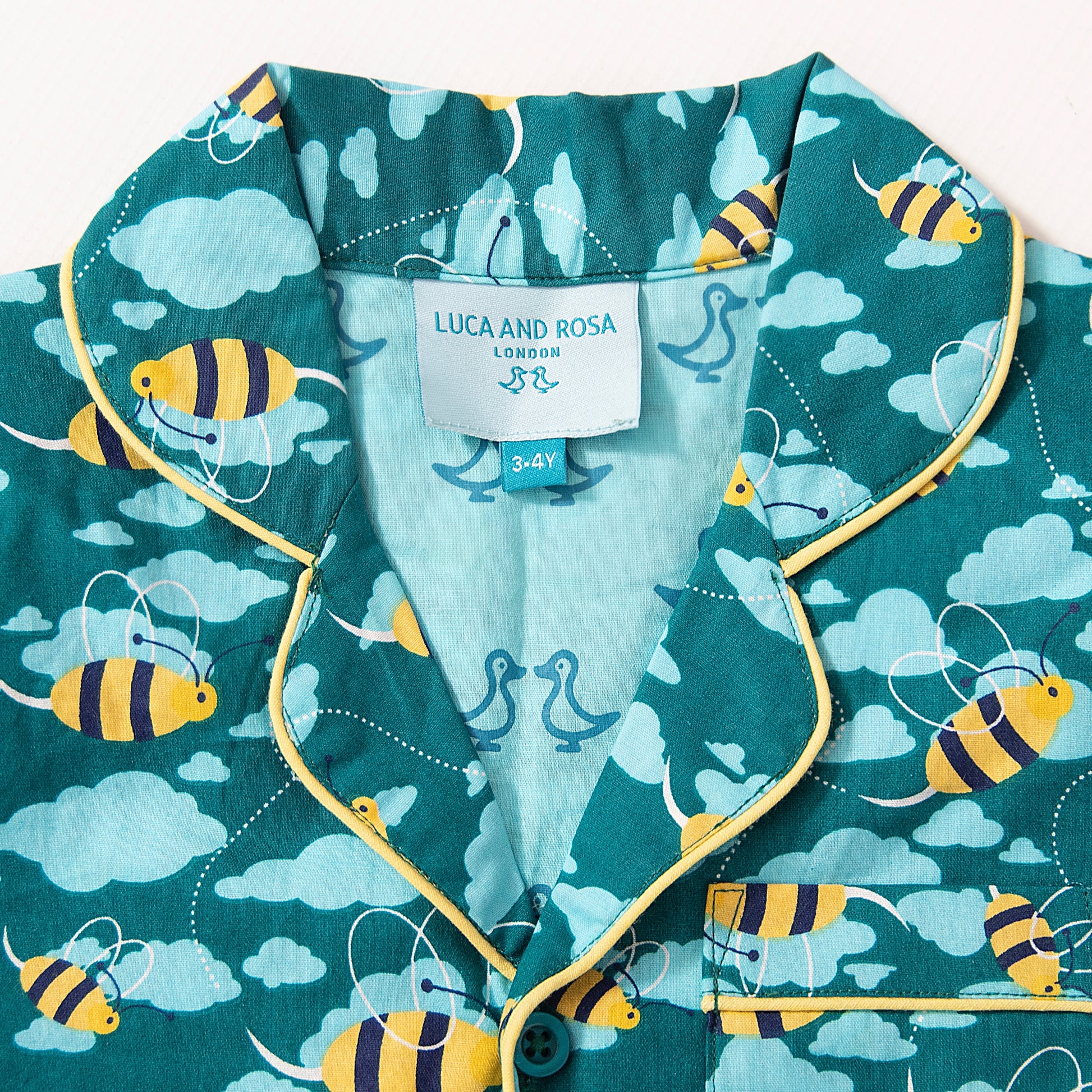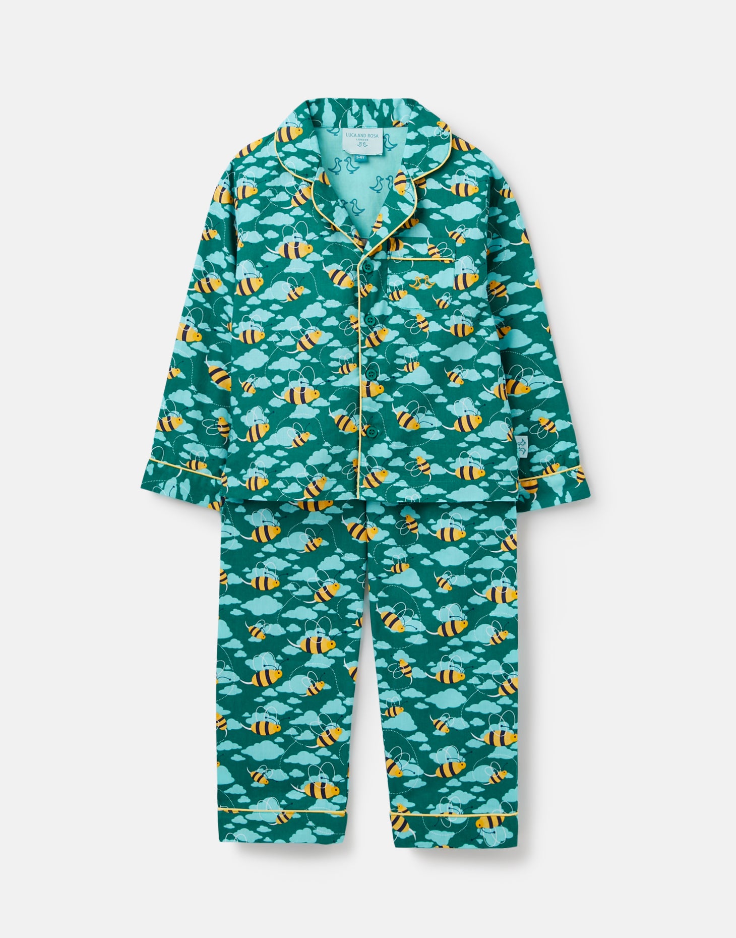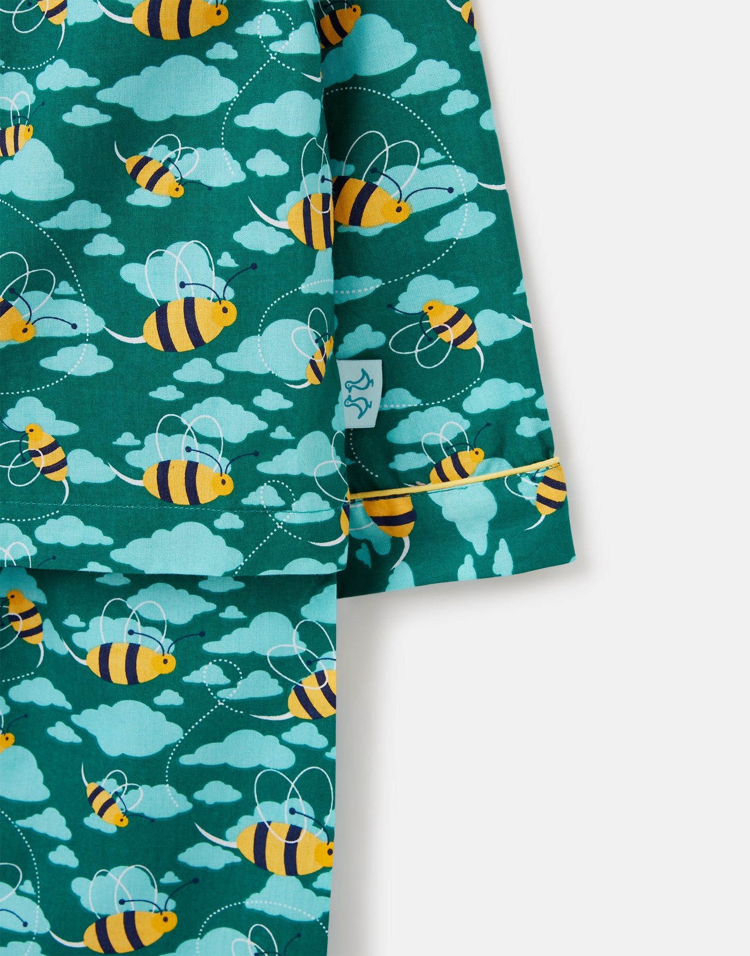 Inspire sweet dreams and a blissful night’s sleep in these sumptuous two-piece boy's pyjamas. Designed in our dark aqua mixed bee print, they have been affectionately crafted from 100% organic cotton poplin.