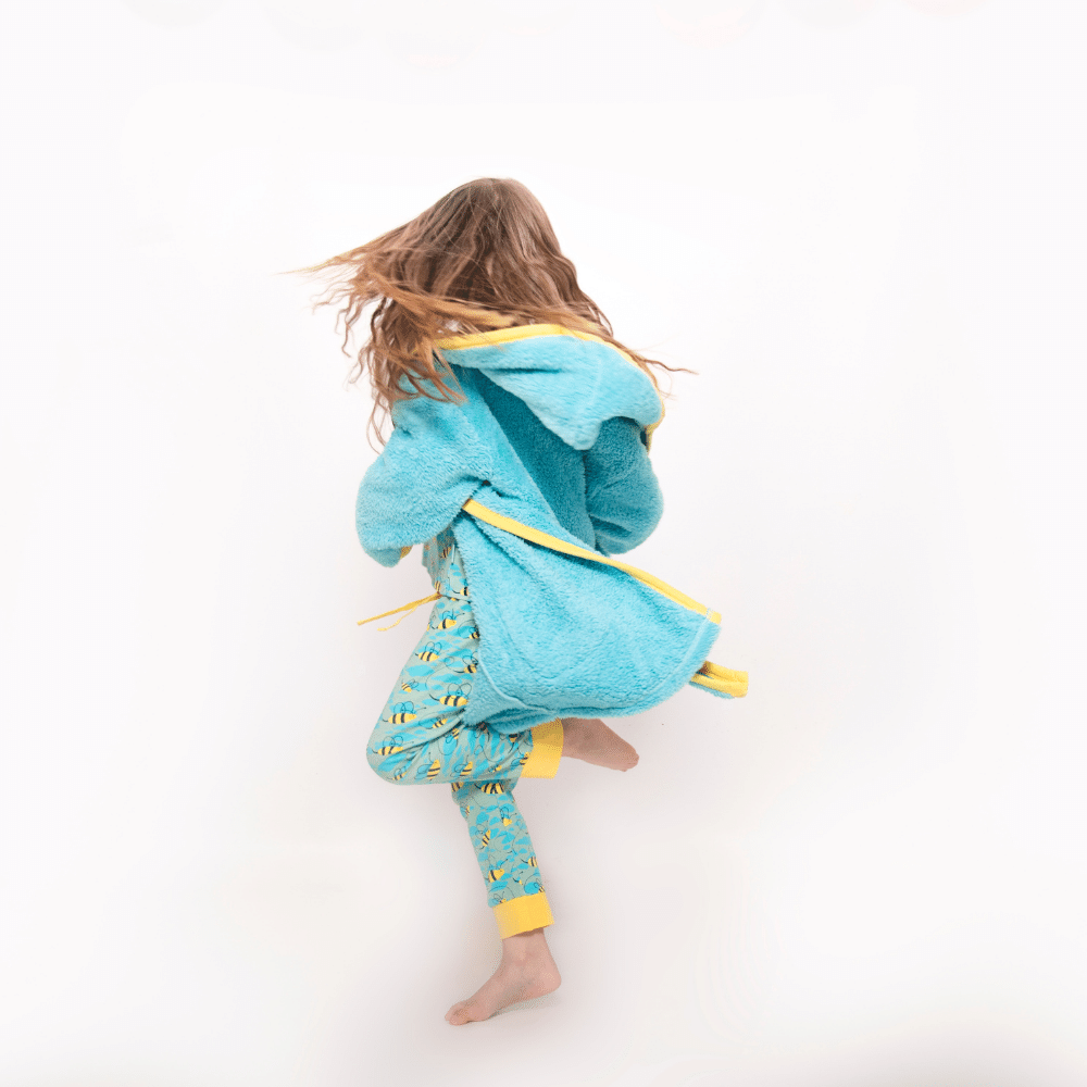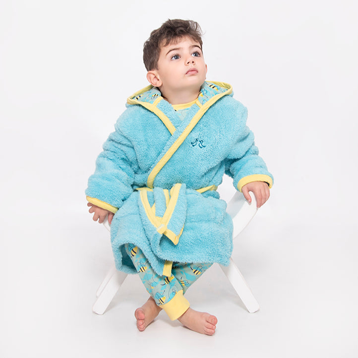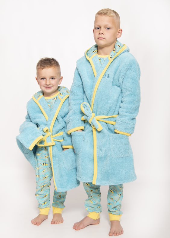 Cosy up in our luxurious soft fleece dressing gown, perfect for cuddling up before bedtime! Lovingly made from super-soft sherpa fleece, the Busy Bees dressing gown features a jersey hood lining with our signature light aqua print. It also has two front pockets and a secure tie belt.