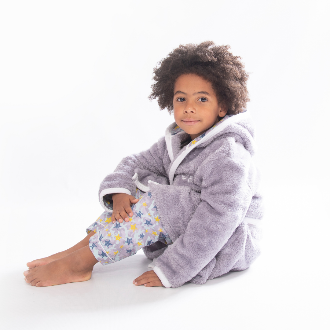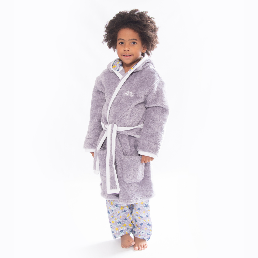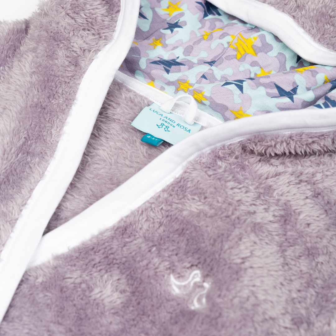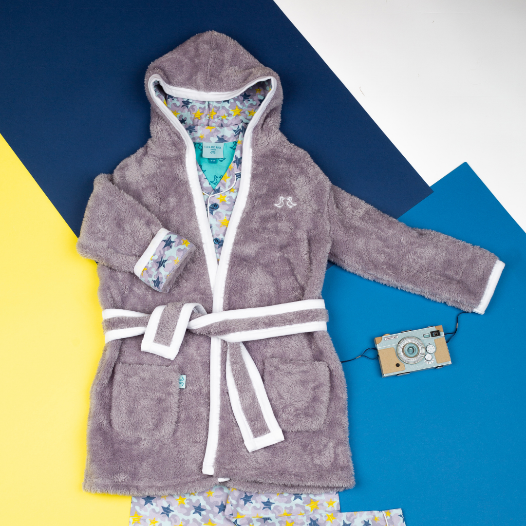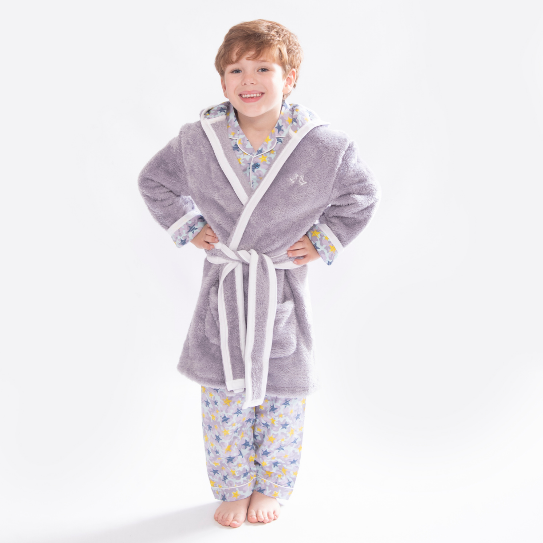 Cosy up in our luxurious soft fleece boys dressing gown, perfect for cuddling up to mummy before bedtime! Lovingly made from super-soft sherpa fleece, the Shining Stars dressing gown features a jersey hood lining with our signature star print. It also has two front pockets and a secure tie belt.