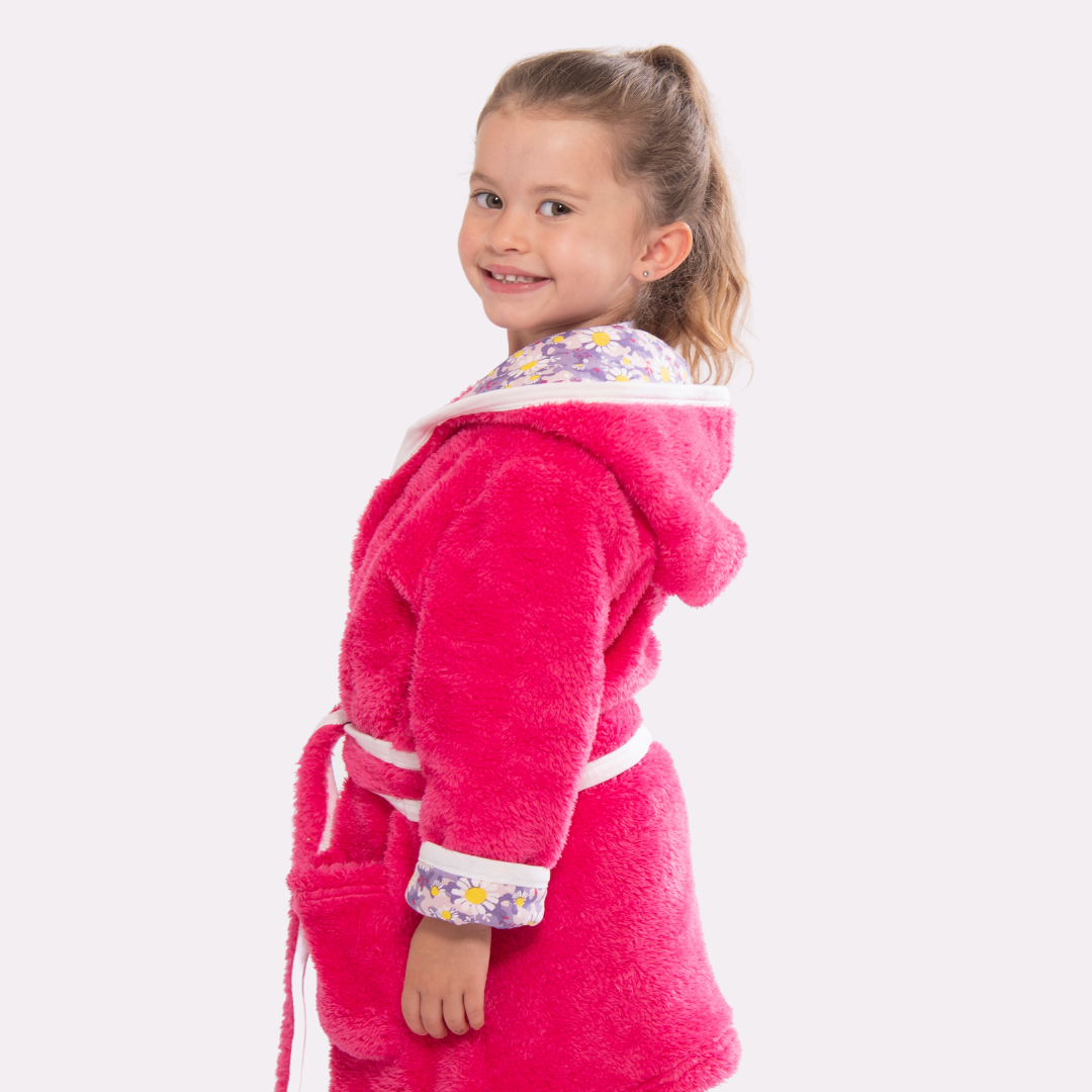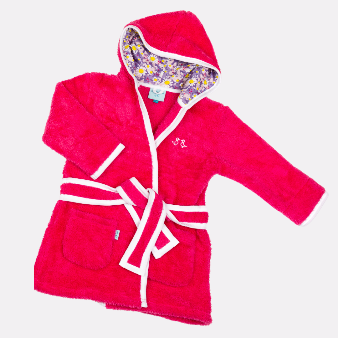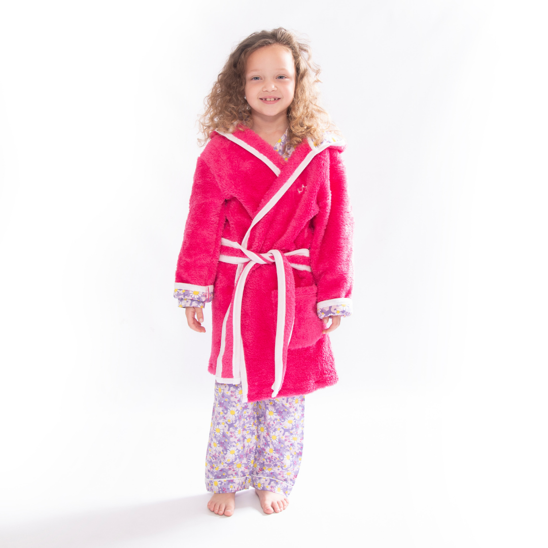 Cosy up in our luxurious soft fleece girls dressing gown, perfect for cuddling up before bedtime! Lovingly made from super-soft sherpa fleece, this children’s dressing gown features a jersey hood lining with our signature dizzy daisy print. It also has two front pockets and a secure tie belt.