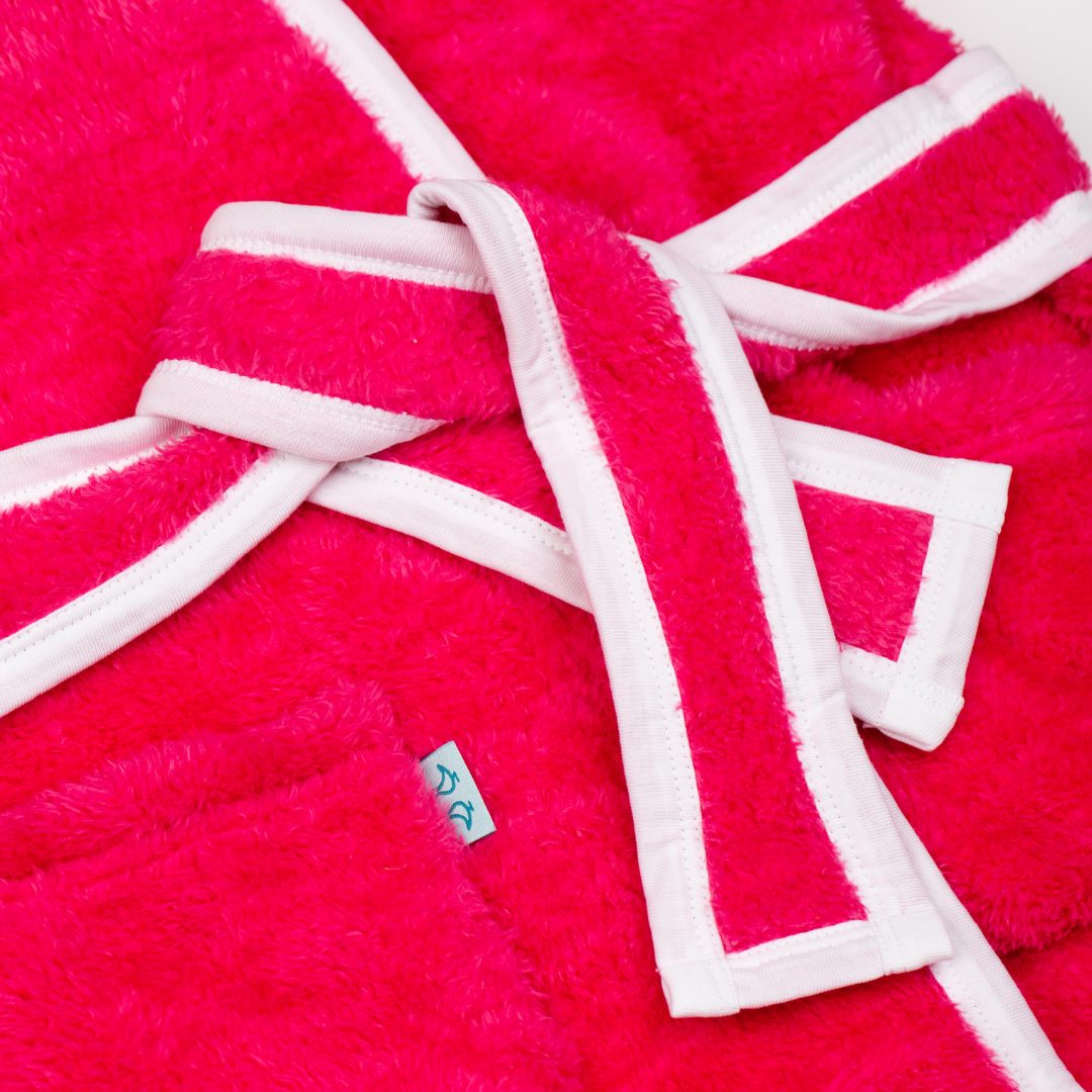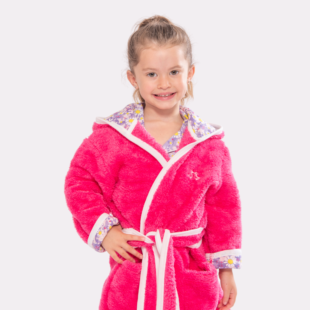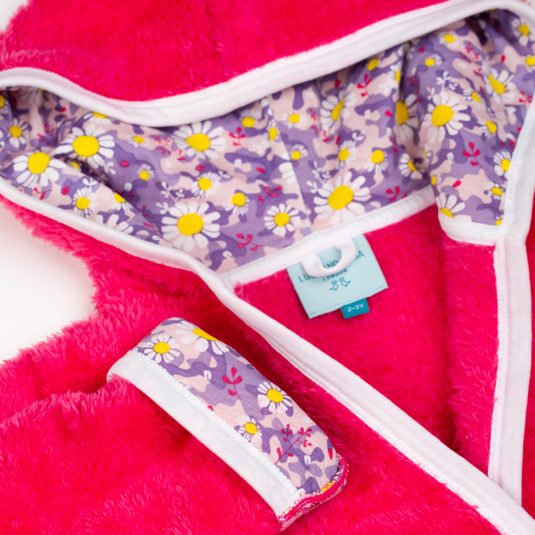 Cosy up in our luxurious soft fleece girls dressing gown, perfect for cuddling up before bedtime! Lovingly made from super-soft sherpa fleece, this children’s dressing gown features a jersey hood lining with our signature dizzy daisy print. It also has two front pockets and a secure tie belt.
