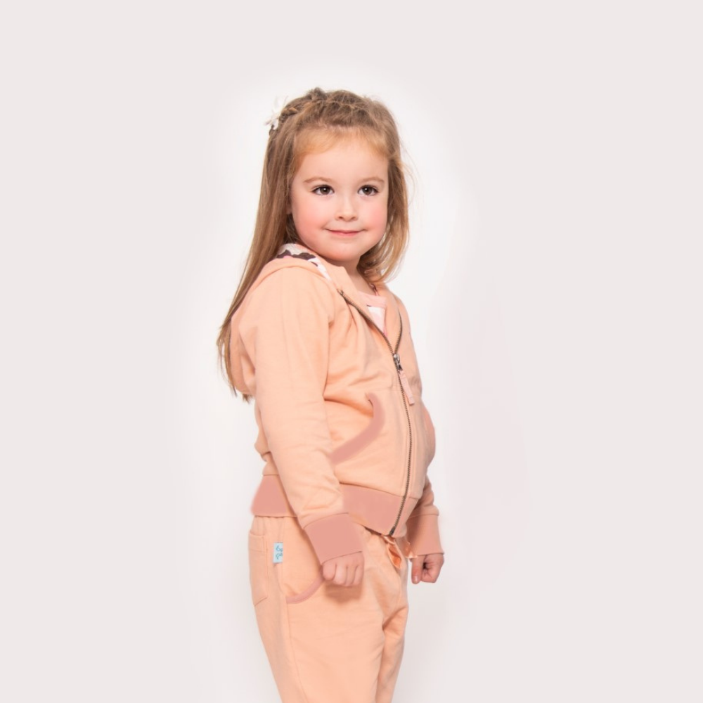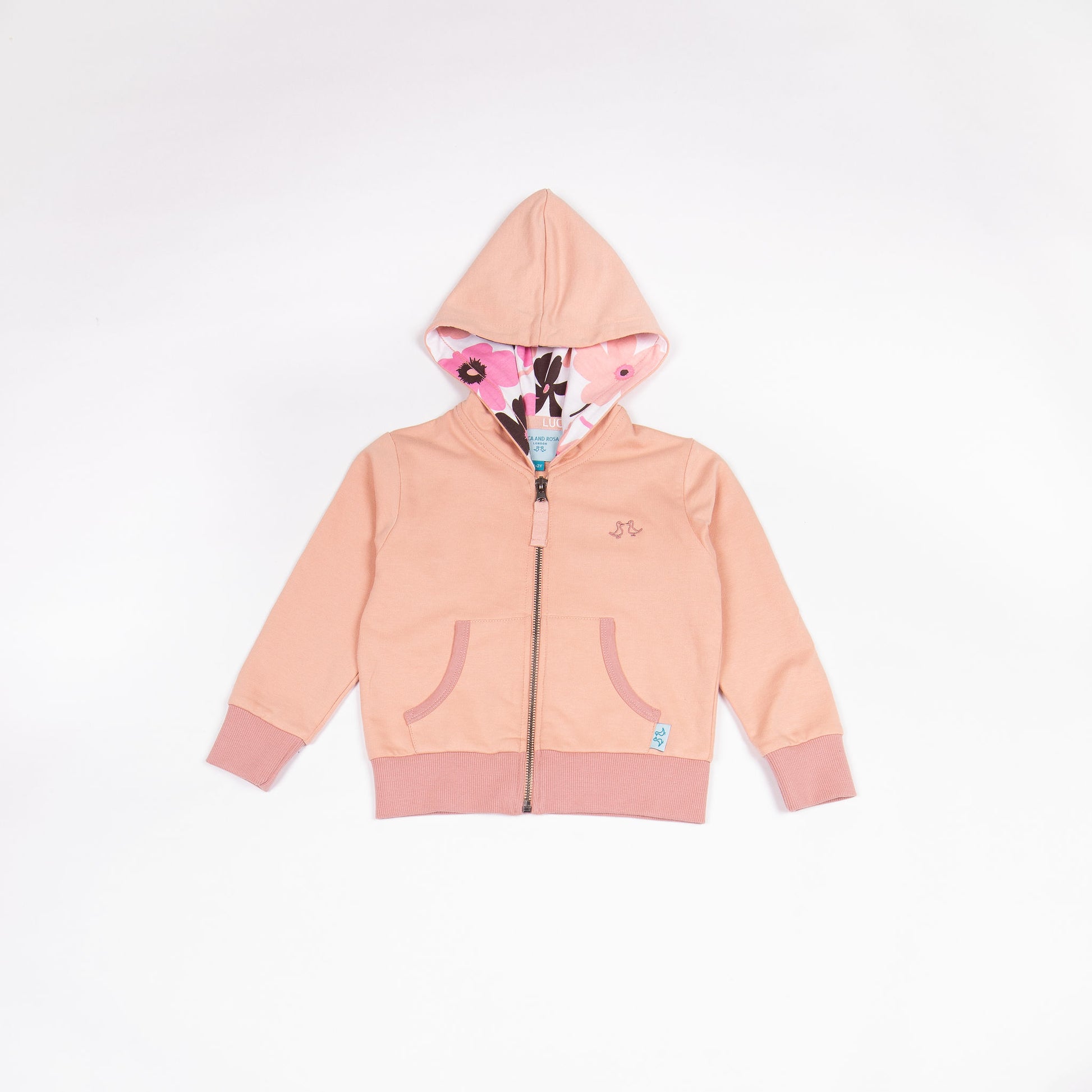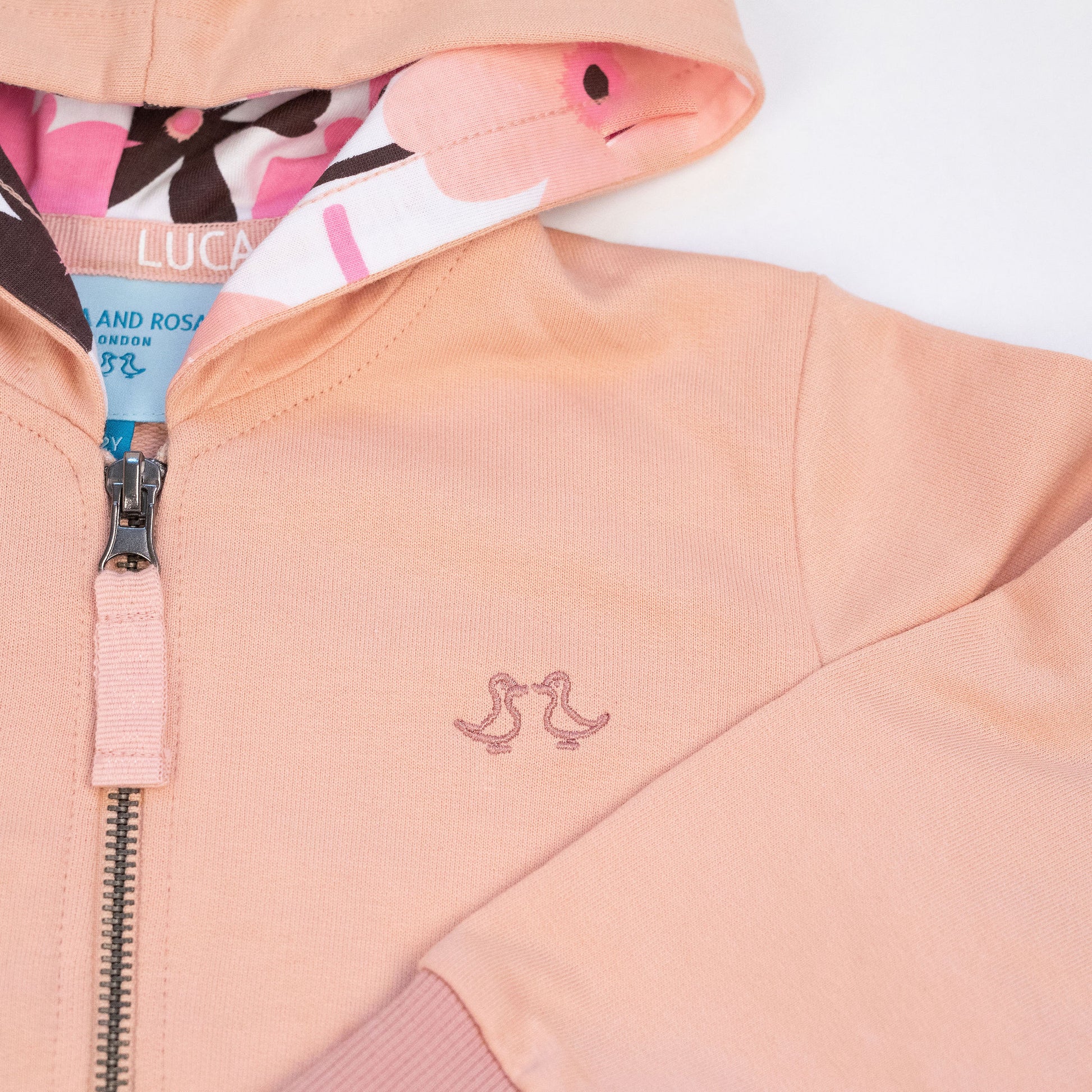 Crafted in 100% Organic Cotton French terry for comfort and breathability, the hoodie features a fun print jersey lining and front zip fastening.