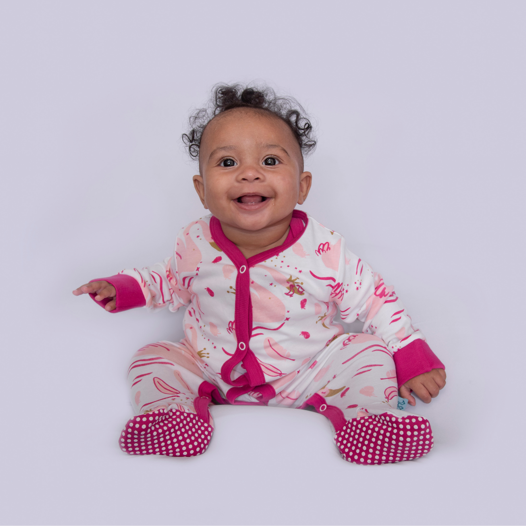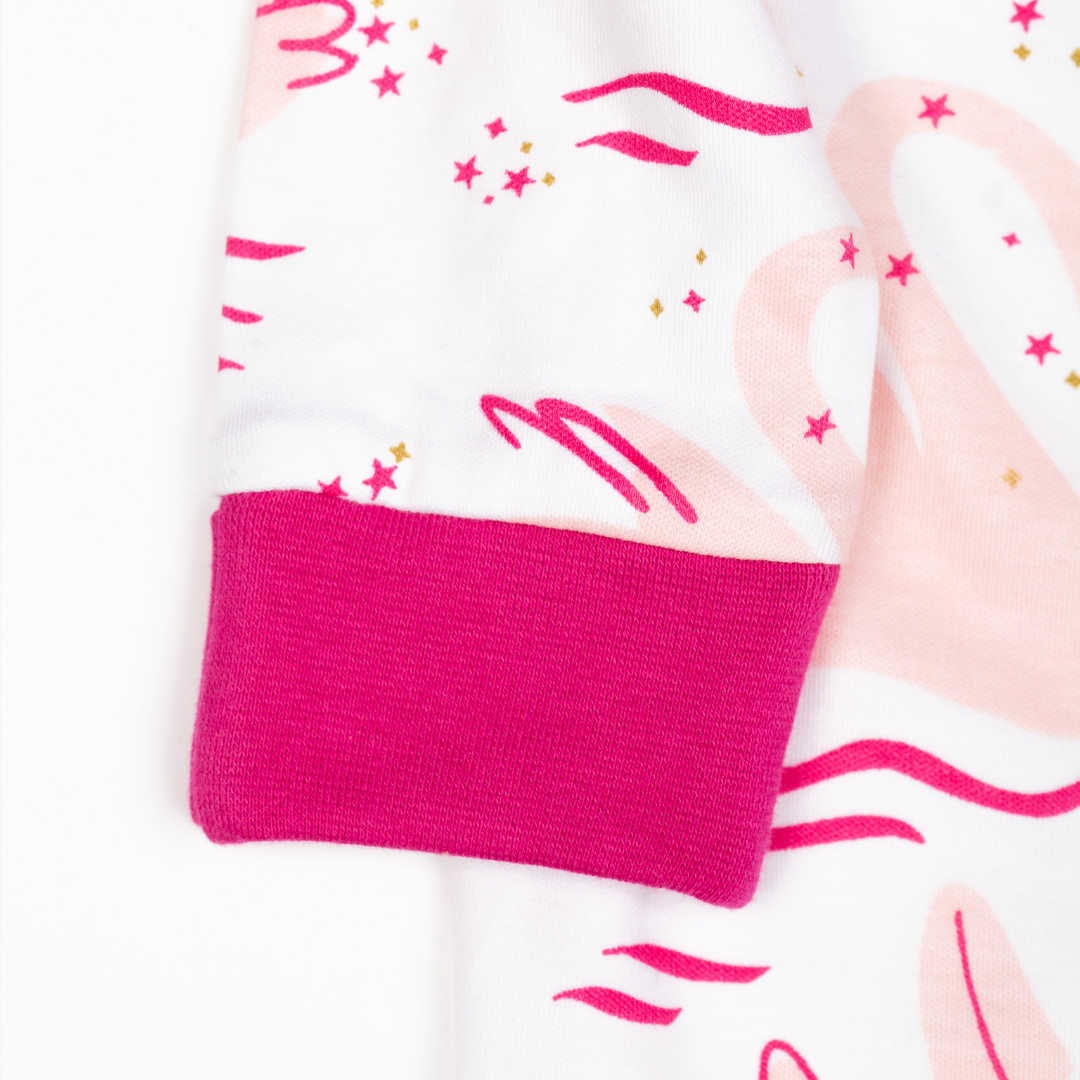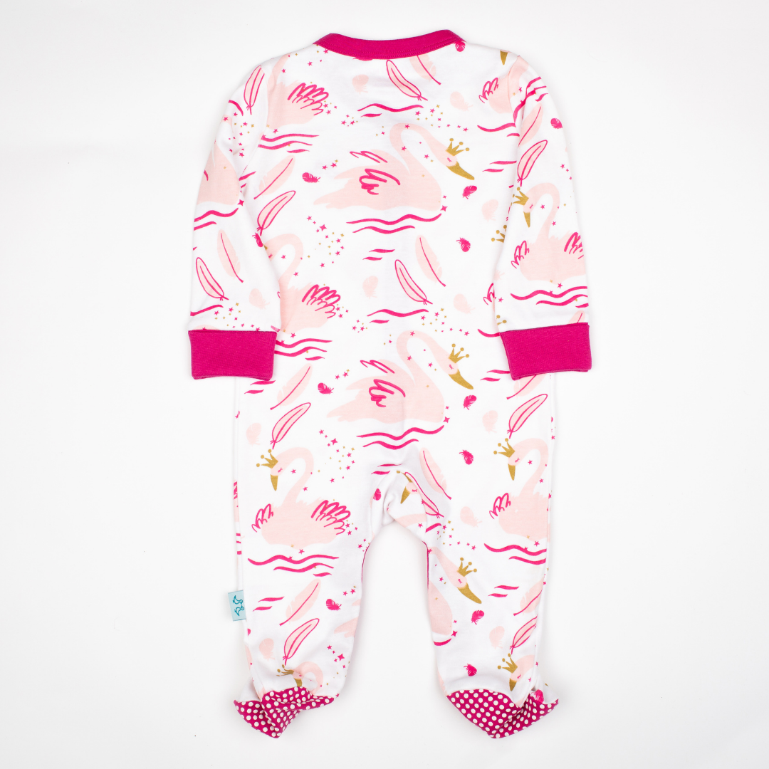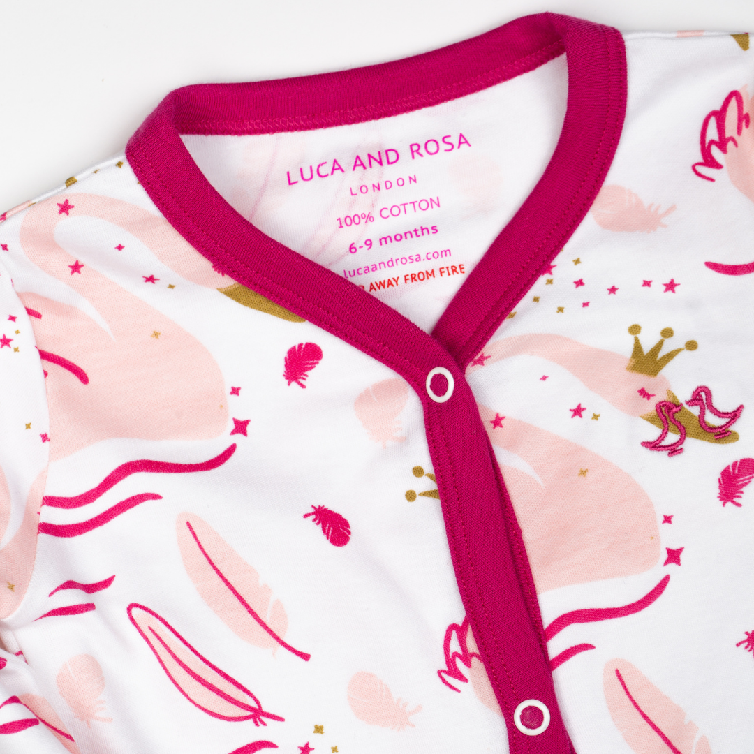 Dress your little treasure in Luca and Rosa London’s luxury baby pyjamas. Our swan princess baby grow, which is tenderly crafted from our beautiful cotton blend, features a multi-popper front opening and contrast colour cuffs. It’s finished with our embroidered logo and playful swan print for that super cute look.